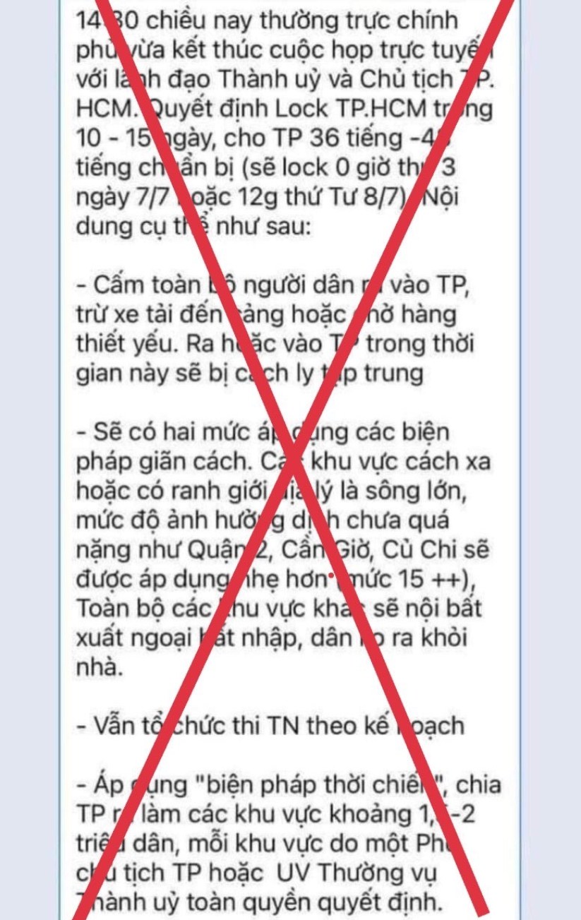 Từ chiều ngày 4/7, trên không gian mạng lan truyền chóng mặt thông tin có nội dung: “Quyết định lock TPHCM trong 10-15 ngày, cho Thành phố 36 tiếng đến 48 tiếng chuẩn bị (sẽ lock 0h thứ 3 ngày 7/7 hoặc 12h thứ Tư 8/7…”.