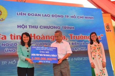(HCM CityWeb) - Ngày 28-6, Liên đoàn lao động TPHCM tổ chức hội thu Chương trình “Nghĩa tình Hoàng Sa – Trường Sa” ủng hộ ngư dân, lực lượng cảnh sát biển, kiểm ngư và xây dựng tượng đài Anh hùng Gạc Ma (Cam Ranh, Khánh Hòa). Ngay tại ngày hội thu, đã có 112 đơn vị, tổ chức công đoàn các cấp, các doanh nghiệp và nhà hảo tâm tham gia ủng hộ Chương trình.
