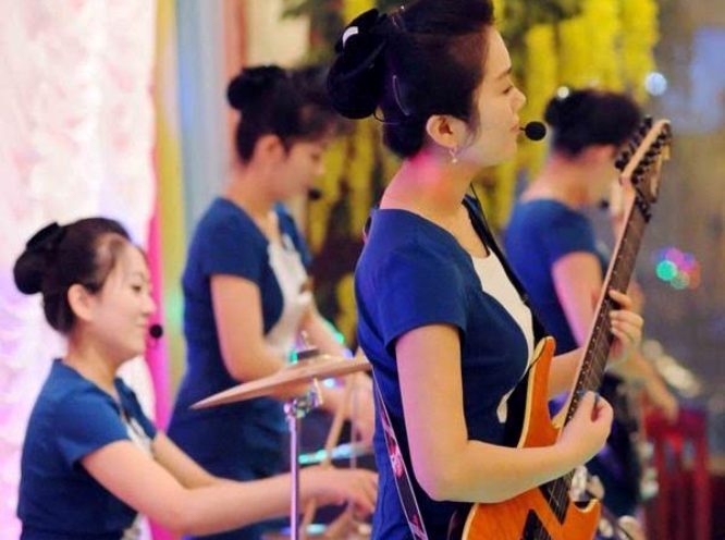 | Các cô gái Triều Tiên phục vụ ở Ryu Gyong có thể hát được bằng tiếng Triều Tiên, Trung Quốc, Nga, tiếng Việt và biểu diễn rất chuyên nghiệp, mỗi người có thể chơi một nhạc cụ. Ảnh: VGP/Trần Nhật Minh |