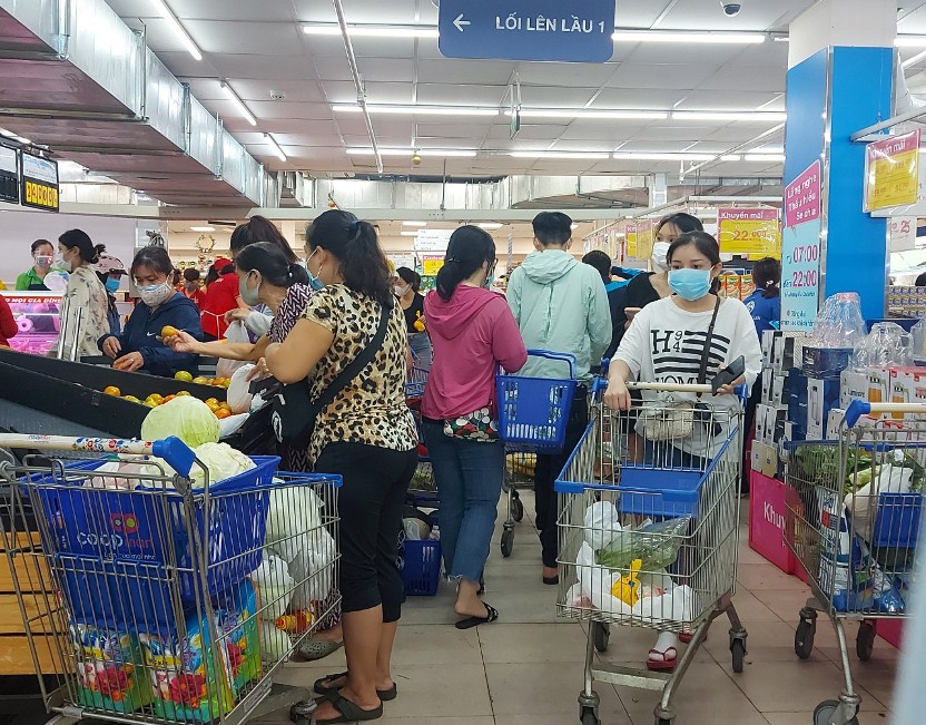 Tại siêu thị Coop Mart Cống Quỳnh (Quận 1), người dân đổ xô về mua hàng rất đông, chủ yếu tập trung ở các quầy bán đồ tươi sống, rau củ quả. Do sức mua tập trung cùng một thời điểm nên siêu thị phải tăng cường nhân viên và lượng hàng hóa để đáp ứng kịp thời nhu cầu mua sắm của người dân.