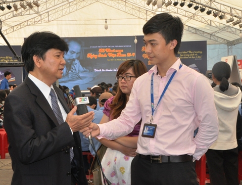 Ông Lê Thái Hỷ, Giám đốc Sở Thông tin và Truyền thông trả lời phỏng vấn về Ngày sách Việt Nam tổ chức tại TPHCM. |