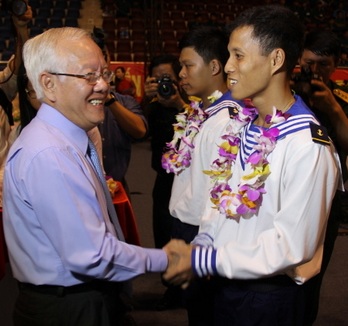 Bí thư Thành ủy TPHCM Lê Thanh Hải thăm hỏi, động viên chiến sỹ. |
