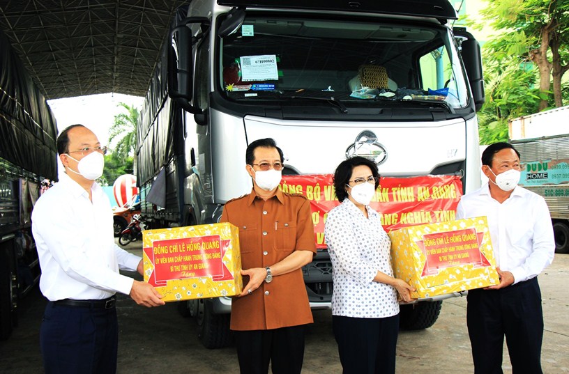Bí thư Tỉnh ủy An Giang Lê Hồng Quang cho biết sát cánh với nhân dân TPHCM phòng, chống dịch COVID -19, đồng bào và chiến sĩ An Giang đã cùng nhau quyên góp ủng hộ gửi tặng người dân TPHCM 65 tấn gạo; 20 tấn rau củ các loại; 10.000 lon cá hộp các loại và nhiều hàng hóa thiết yếu khác.