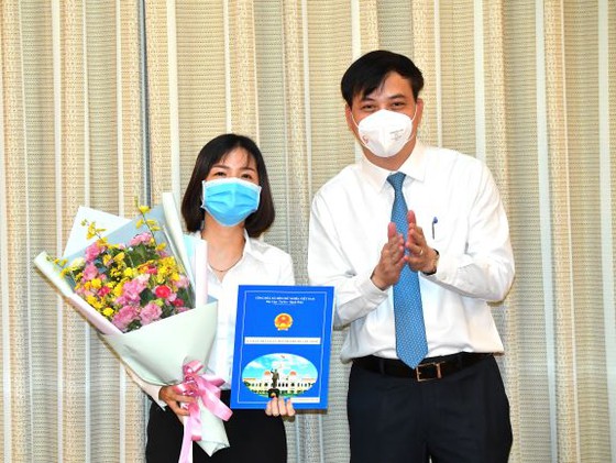 Phó Chủ tịch UBND TPHCM Lê Hòa Bình trao quyết định điều động và bổ nhiệm bà Nguyễn Thị Thu Nga. Ảnh: SGGP |
